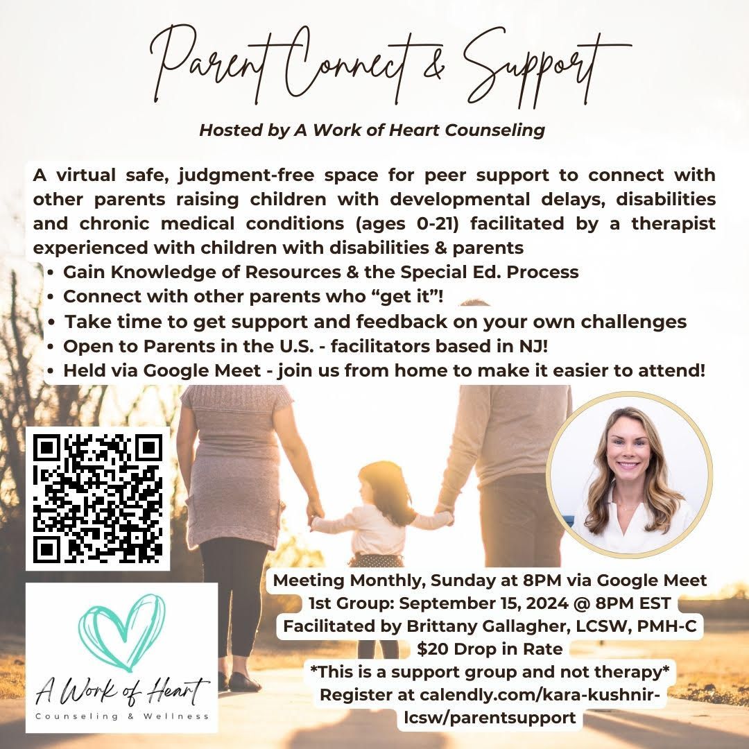 A Work of Heart Counseling is hosting a support group for parents of children with disabilities. This group runs once a month via Google Meet beginning on Sunday, September 15, 2024, at 8PM. Please see the attached flyer for further information.